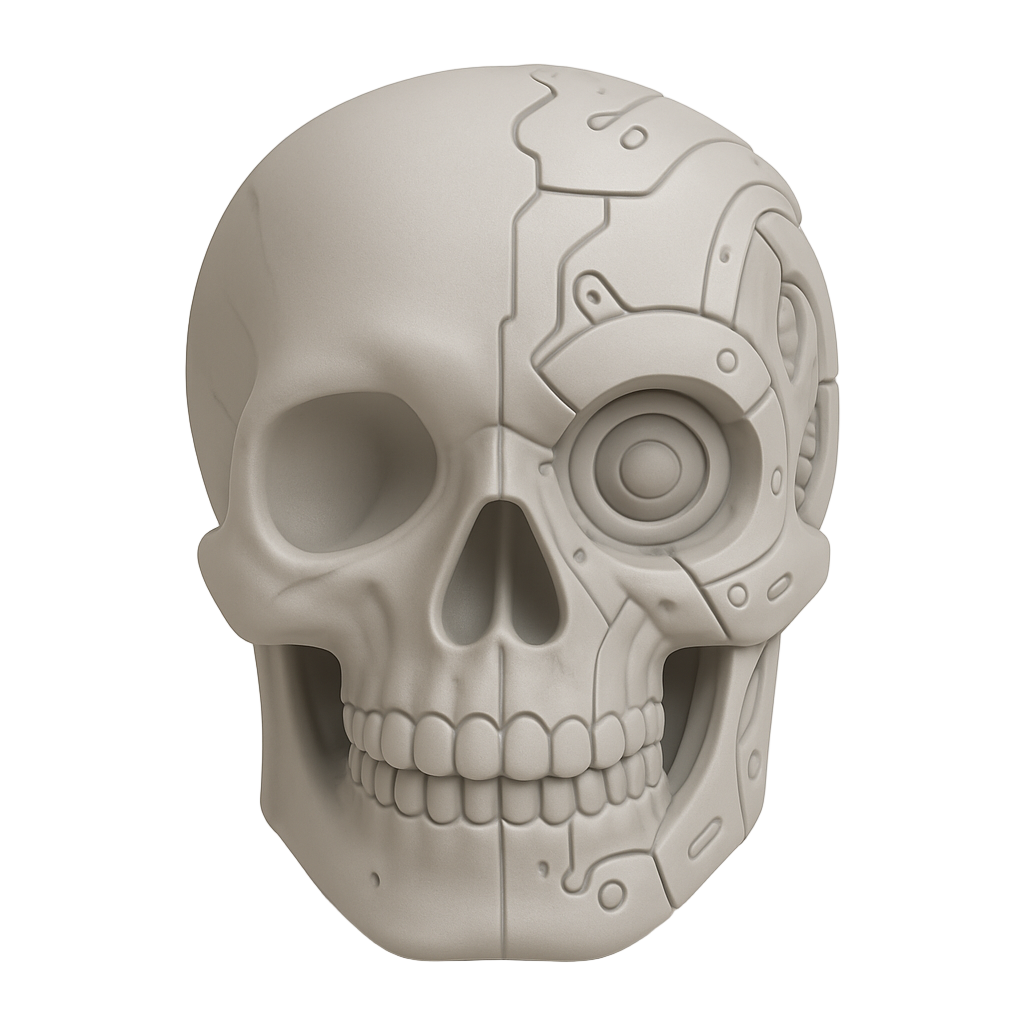 Introducing NeuroForge, a hauntingly beautiful fusion of bone and circuitry. Half organic, half engineered, this meticulously crafted figurine bridges life, death, and design with stunning contrast — smooth ivory bone flowing into brushed steel and glowing cybernetic lines. Every contour tells a story of evolution: flesh meeting function, art meeting algorithm.