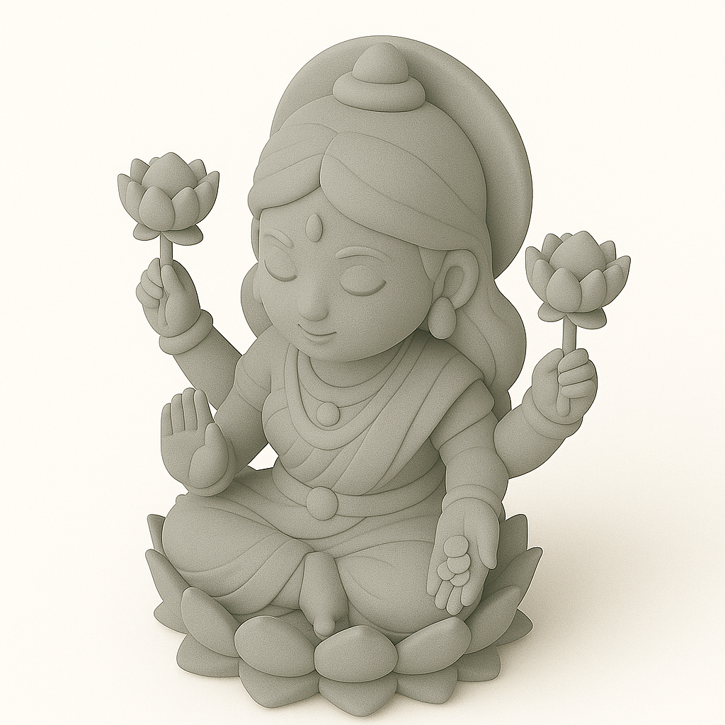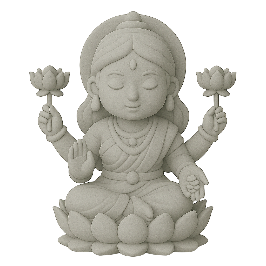 Seated gracefully on a blooming lotus, Lakshmi radiates calm happiness. In one hand she holds a flower of beauty, in another she offers open palms of blessing—reminding us that kindness and gratitude are the greatest treasures of all. Her design is smooth, balanced, and paint-friendly, perfect for curious hands that want to create something truly meaningful.